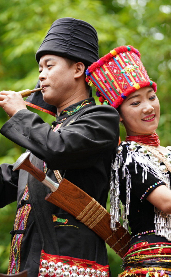 拉祜族人口約41萬(wàn),主要聚居在思茅、臨滄境內(nèi)的瀾滄江沿岸地區(qū)。拉祜族寨與基諾族寨緊緊毗連,寨內(nèi)建有拉祜族茅草房、大公房、教堂、牛棚以及葫蘆廣場(chǎng)。位于拉祜族寨中心位置的葫蘆廣場(chǎng)形似一只碩大的葫蘆平面,核心有一組石雕葫蘆。傳說(shuō)拉祜族的祖先誕生于葫蘆中,因此葫蘆廣場(chǎng)表現(xiàn)了拉祜族的祖先崇拜觀念。漫步拉祜族寨,葫蘆笙悠揚(yáng)婉轉(zhuǎn)、口弦聲余音繞梁,表現(xiàn)拉祜族勞動(dòng)場(chǎng)面的“豐收擺舞”充滿歡騰和激情,展示了拉祜族的民間...